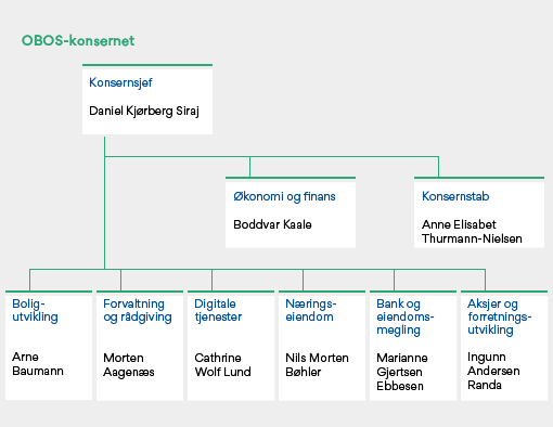 OBOS er organisert i seks forretningsområder; boligutvikling, forvaltning og rådgivning, næringseiendom, digitale tjenester, bank og eiendomsmegling samt aksjeinvesteringer og forretningsutvikling. I tillegg kommer støttefunksjonene økonomi og finans og konsernstab.