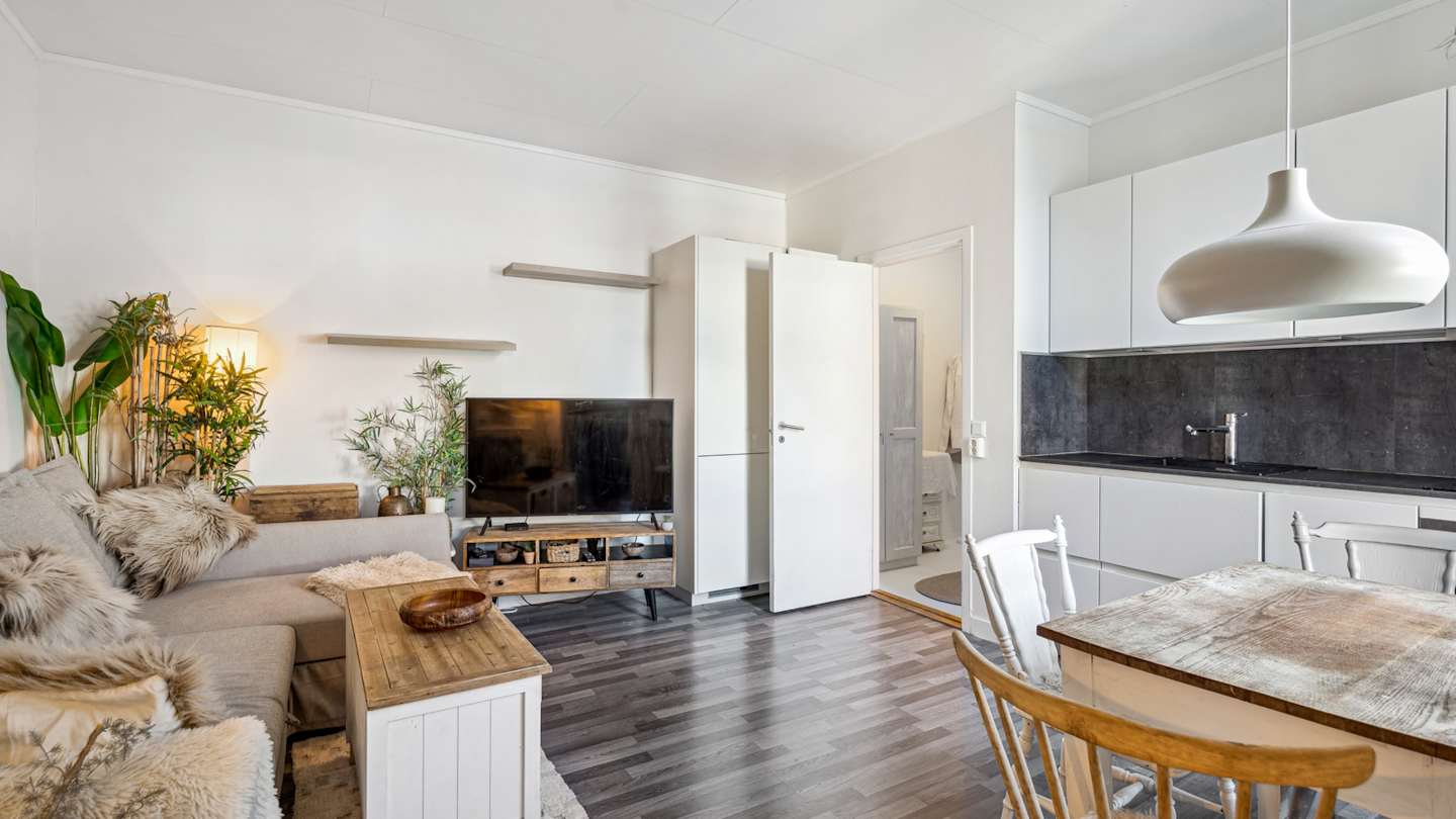 Ifølge tidligere salgsannonse ble kjøkkenet pusset opp av forrige eier i ca 2019. Kjøkkenet har innredning med glatte fronter, laminat benkeplate med nedfelt vask, våtromsplater e.l over benkeplate, belysning over benkeplate samt integrert koketopp og komfyr. På den ene veggen er det også satt inn et kombinert kjøl- og fryseskap som medfølger salget. I kjøkkendelen er det plass til en lite bord hvis man ønsker det.Stue: