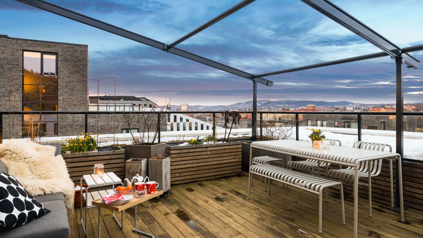 Flott 3-roms leilighet beliggende i 8. etasje med 27 kvm privat takterrasse med pergola. Nydelig utsikt! Garasje. Heis.