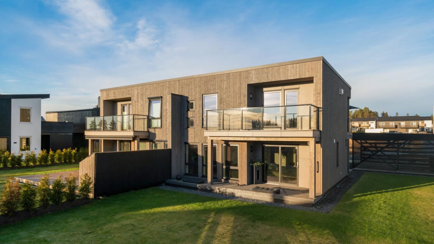 Ny, moderne vertikaldelt tomannsbolig m/dobbel carport, terrasse, hage og 2 verandaer. 2 bad, vaskerom og 3 soverom.