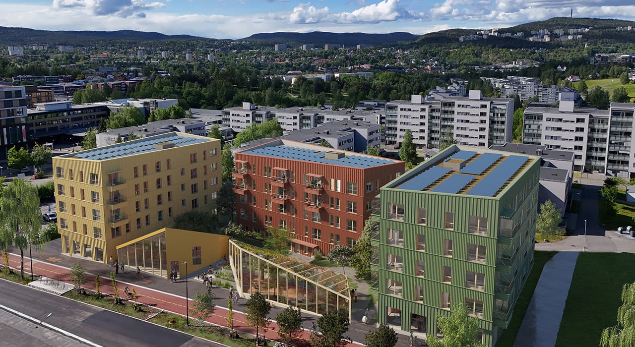 Bygningene blir såkalte passivhus med takene dekket av solceller. Det skal bygges med klimavennlige materialer og fasadene blir kledd med treverk.