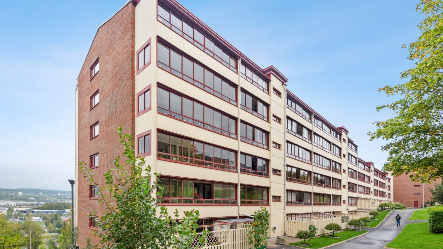 Lys og romslig 2-roms med stor innglasset balkong på 10 m2. Heis. Garasje. Varmtvann inkl. Markanært. Modernisering.