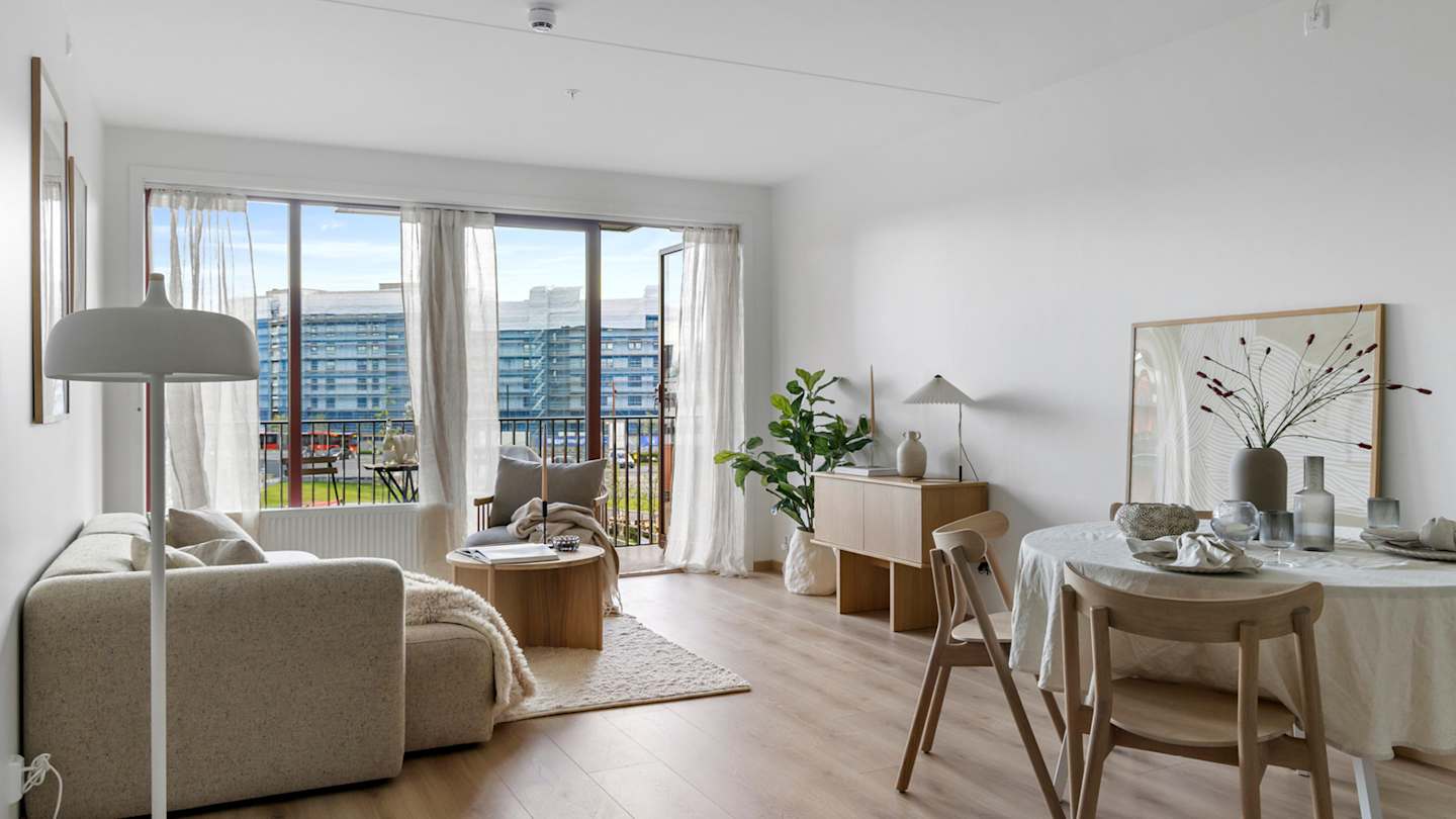 Lys og moderne 4-roms (ny des. 2024) med sydvestvendt balkong 9m². Felles takterrasser. Vannbåren varme. IN-ordning