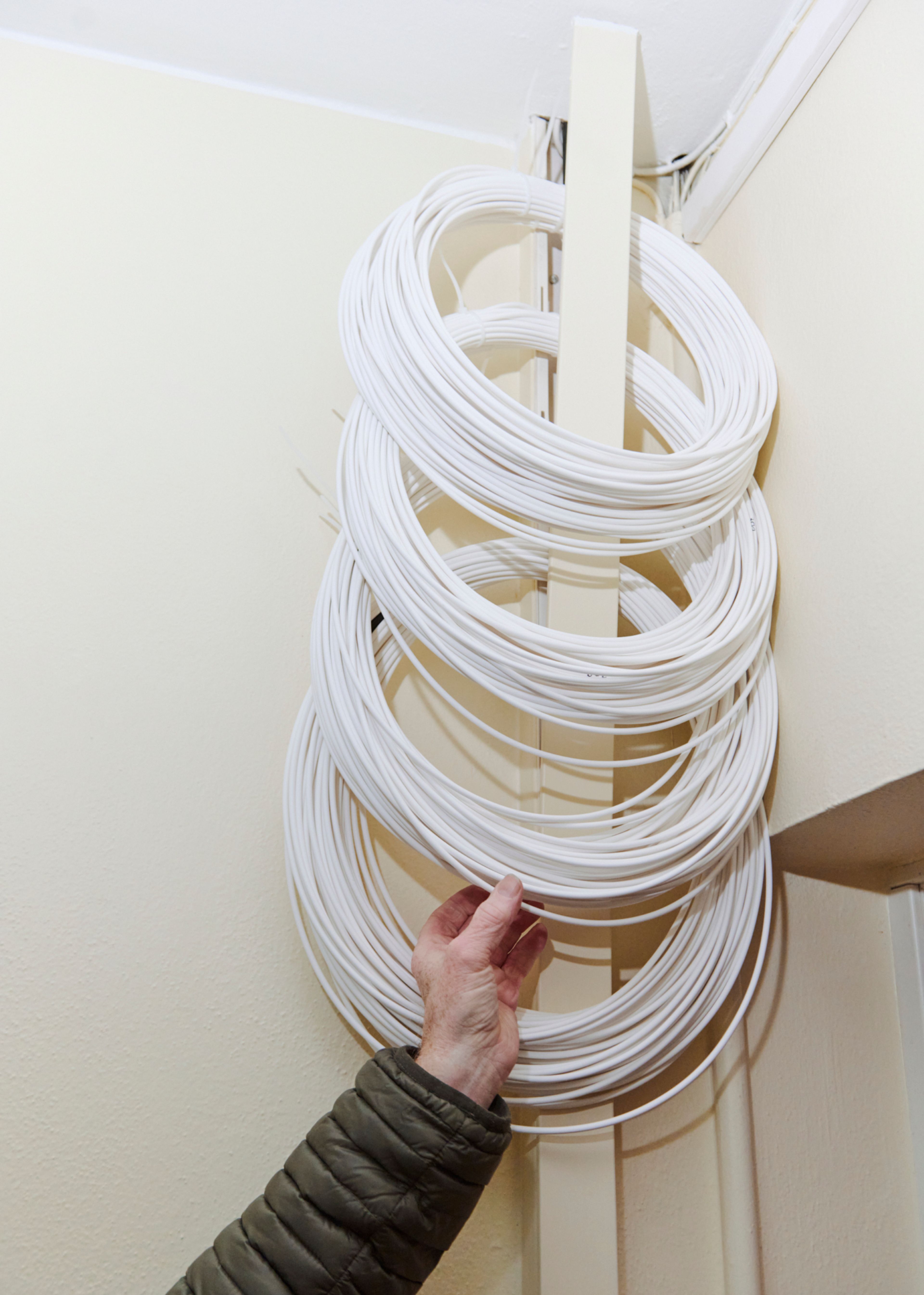 Dekket til den gamle kobberkabelen gjenbrukes for å føre fiber opp gjennom etasjene.