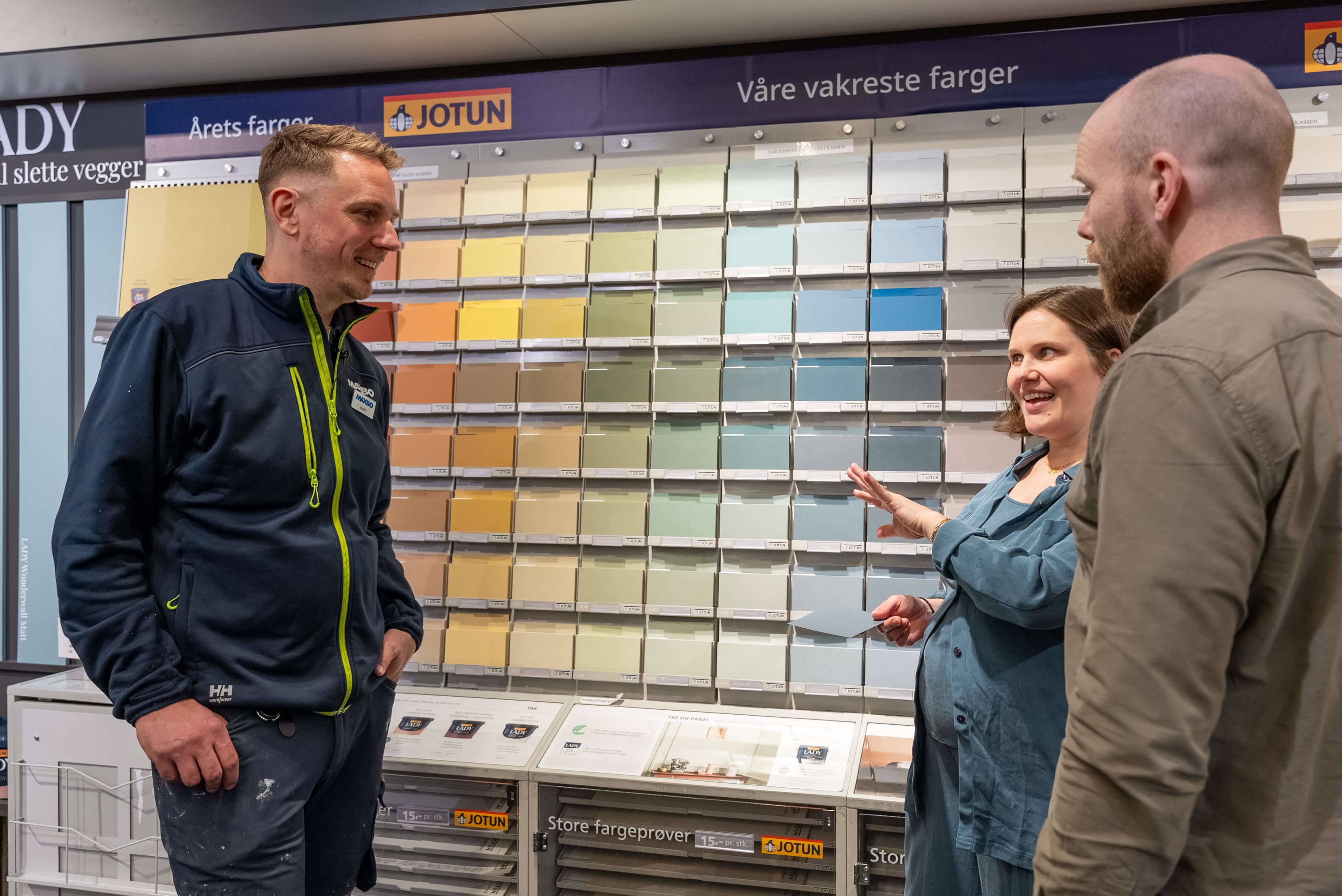 Ronja Johnstad Knutzen (t.h) er interiørselger hos Bohus, og står for øyeblikket i avdelingen for lamper og belysning på Alnabru. Anne Birgit og Kristoffer er på jakt etter en tak- og nattbordslampe. De velger en klassisk taklampe med papirskjerm og en nattbordslampe som kan lades opp via USB-kabel.