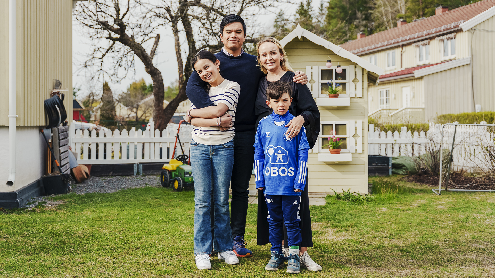 I hagen står det i tillegg et lekehus kjøpt på Maxbo. Det er en av flere ting familien har handlet med OBOS-rabatt.