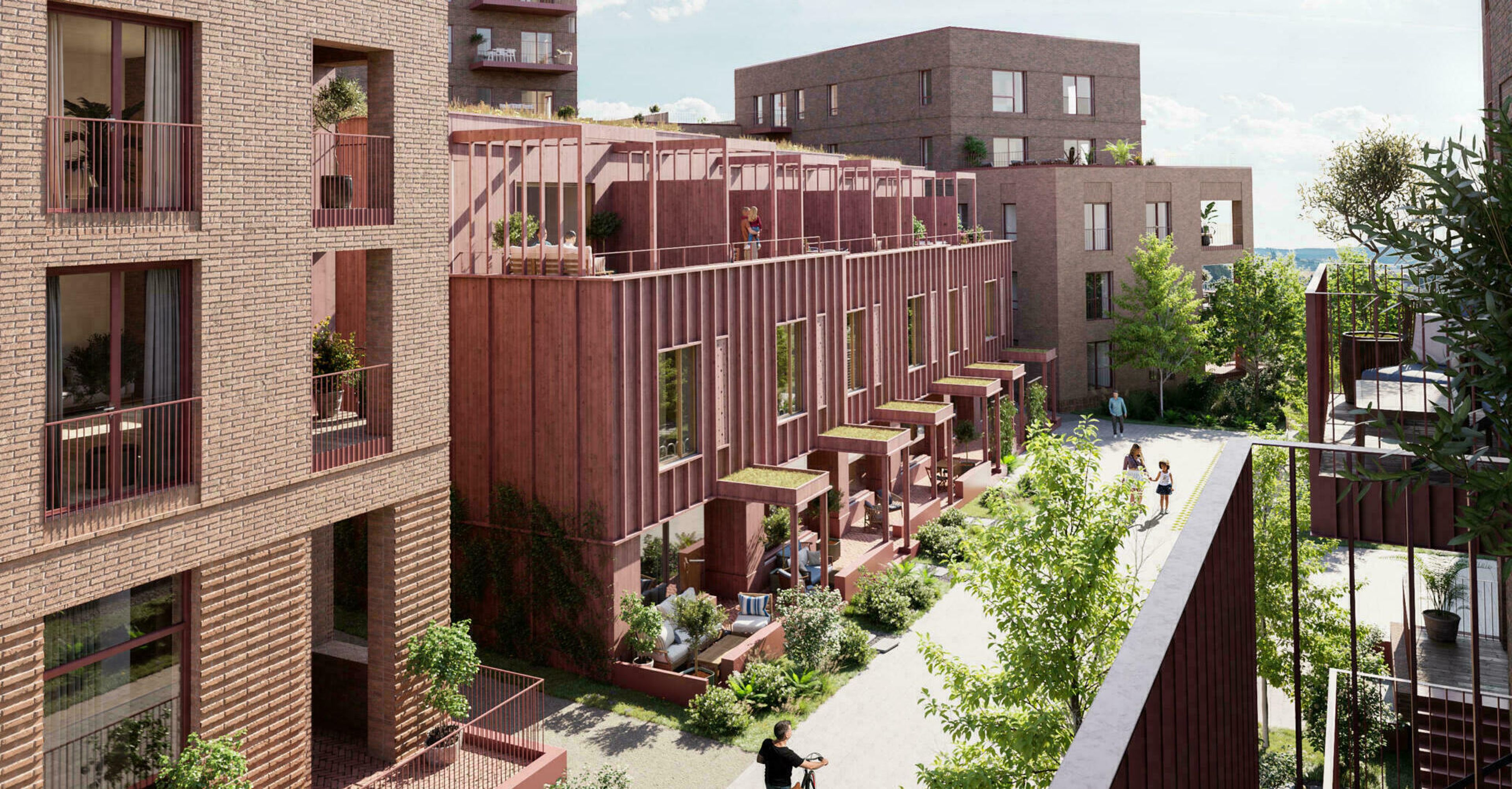 Illustrasjon: På Nansenløkka på Fornebu skal vi bygge cirka 600 mer miljøvennlige boliger, både leiligheter og rekkehus. Sistnevnte bygges i massivtre, som er positivt for både miljøet og inneklimaet. Boligene blir liggende mellom Nansenparken og Fornebu S.